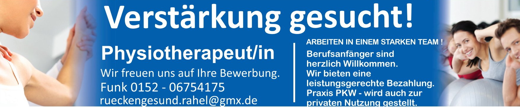 Da wir gemischtes Klientel haben, gibt es keine Behandlungsschwerpunkte. Wir behandeln Kinder, Erwachsene und Senioren mit alterstypischen Schwierigkeiten, sowie Patienten mit orthopädischen Erkrankungen oder nach Operationen. Neben dem Lohn übernehmen wir auf Wunsch auch Kindergarten- oder Krippenkosten. Ein Dienstfahrzeug wird gestellt. Dieses kann gerne auch privat genutzt werden. Ein Bewerbungsschreiben ist nicht zwingen nötig. Ein Lebenslauf sowie Berufszertifikate werden zum Bewerbungsgespräch gefordert.